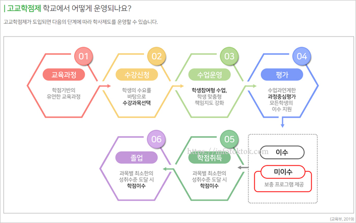 성취율이 40% 미만인 경우 I(Incomplete) 등급을 받게 되는데요. I등급을 받으면 해당 과목이 미이수 처리된다고 합니다. 만약 학업성취수준이 40% 이하인 I를 받으면 보충 이수(과제 및 온라인 과정 등)를 통해 학점을 취득해야 합니다. 특히 미이수가 발생한 학생에 대해 교육부는 각 학교에 책임 교육을 강화한다는 방침이라고 합니다.