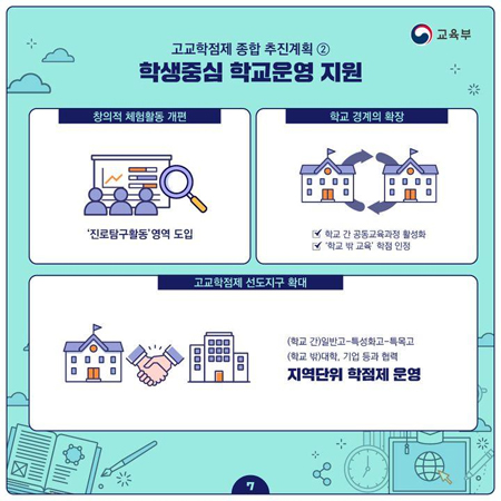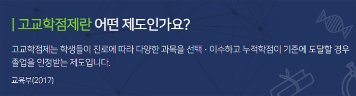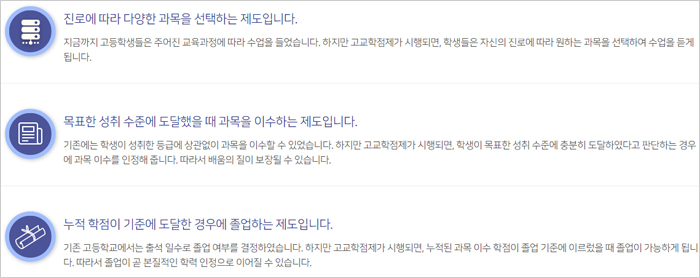 특히 학습의 속도가 다르고 학습의 목표도 다른 학생들을 수직적으로 서열화하는 것은 학생들의 학습 의욕을 저하시킨다고 합니다. 고교학점제는 학생 선택형 교육과정 운영을 통해 다양한 능력과 적성을 가진 학생 개개인의 역량을 최대한 발휘할 수 있도록 지원한다고 합니다.
