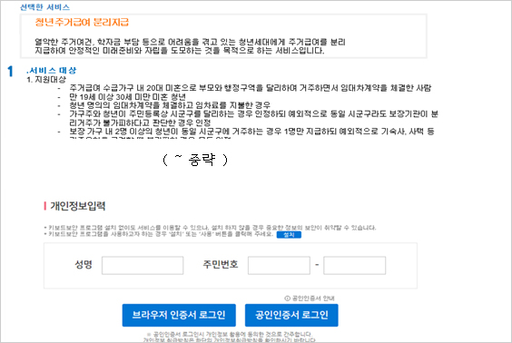 기존 주거급여 수급자라면 청년 주거급여 분리지급 신청 시 청년 주거급여분리지급을 선택합니다. 신청서비스 안내를 확인 후 개인정보를 입력한 다음 인증서를 통한 로그인을 합니다.
