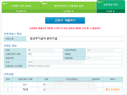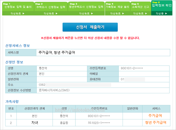 청년 주거급여 주택조사 정보 입력 후 "가족관계제공동의", "소득재산신고" 등은 기존 주거급여 신청과 동일합니다. 입력된 신청서 정보를 확인 후 신청서 제출하기 버튼을 클릭하여 온라인신청을 행복e음으로 전송합니다.