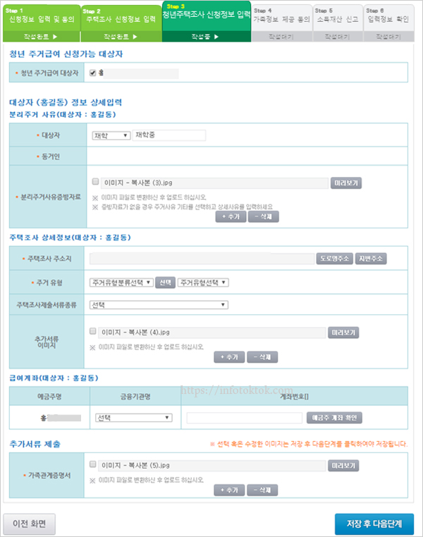 청년 주거급여 주택조사정보를 입력합니다. 제출서류 종류로는 재직증명서, 재학증명서, 학원비 납입증명서, 4대보험가입자 확인서, 가족관계증명서 등이 있습니다. 가족관계증명서는 온라인신청 시 서비스대상자(청년)의 결혼여부 확인이 불가능하므로 첨부해야 합니다.