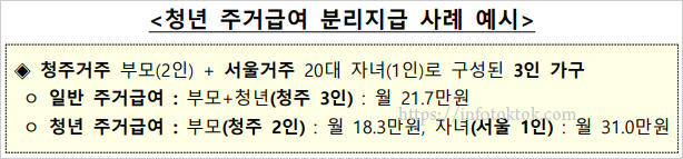 예를 들어 부모가 충북 청주에 거주하고 20대 자녀는 구직을 위해 서울에 체류한다면 청년 주거급여 신청자격 지급 대상이 될 수 있다고 합니다. 이 경우 기존에는 일반 주거급여를 적용받아 부모와 청년 등 3인을 대상으로 월 21만 7,000원이 제공됐었습니다. 하지만 올해부터 변경된 청년 주거급여 분리지급제도를 활용하면 청주에 거주하는 부모는 월 18만 3,000원, 서울에 체류하는 청년은 월 31만원을 각각 받게 된다고 합니다.